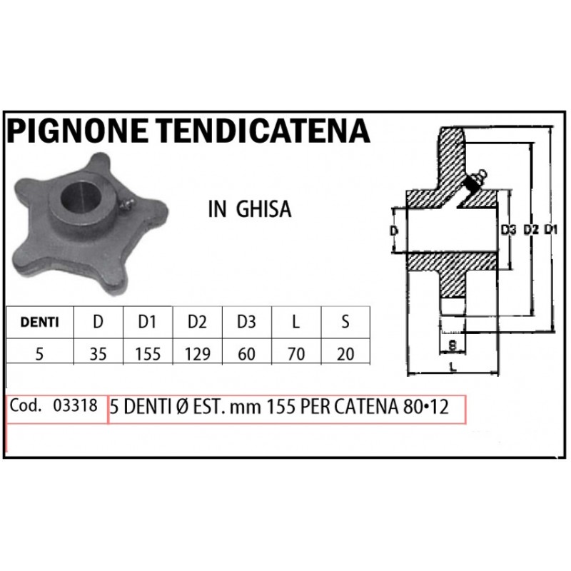 PIGNONE TENDICATENA GHISA 5 DENTI d. EST. mm 155 FORO d. 35 PER CATENA 80•12